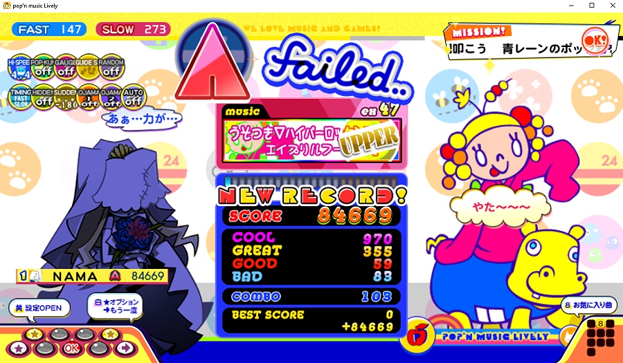 45あとハイパーロッケンローレだけになった。左手が弱いと左右振り付いていけないぜって書いてあったけど私は露骨に右青取れないからじゃあ鏡効くや〜んと安易に試してボコボコにされ、涙