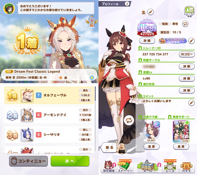 オルフェ引いて思ったのは私はウマ娘と史実の馬をイコールで結んで同一視してないから(ウマ娘公式もそのスタンスだし)別に違ってもいいしウマ娘オルフェは顔がいいし声もいいから大好きだけど(でもディープは絶対ウマ娘になるな(二回目)ストーリーではオルフェーヴルのエッセンスが弱く感じてしまったのでちょい残念に感じた。